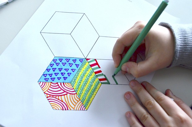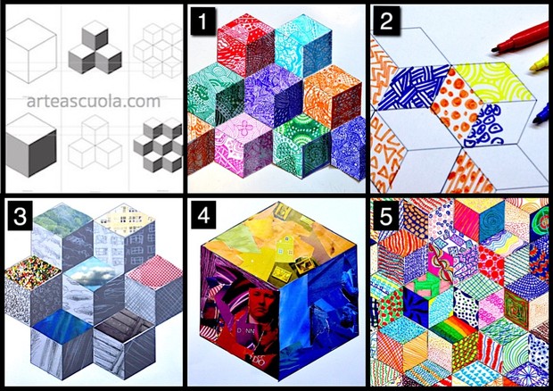 from arteascuola.com Starting from a cube, or by a series of cubes that you can find in these 6 worksheets, you meet here some ideas to be carried out in the classroom. The activities are practical and quick, but effective. There is the chance to work on cubes of different sizes, with shaded or white faces. The activities include collaborative project, collage, zentangle drawing, textures and color theory. You can find complete tutorial here http://arteascuola.com/?p=9950&preview=true